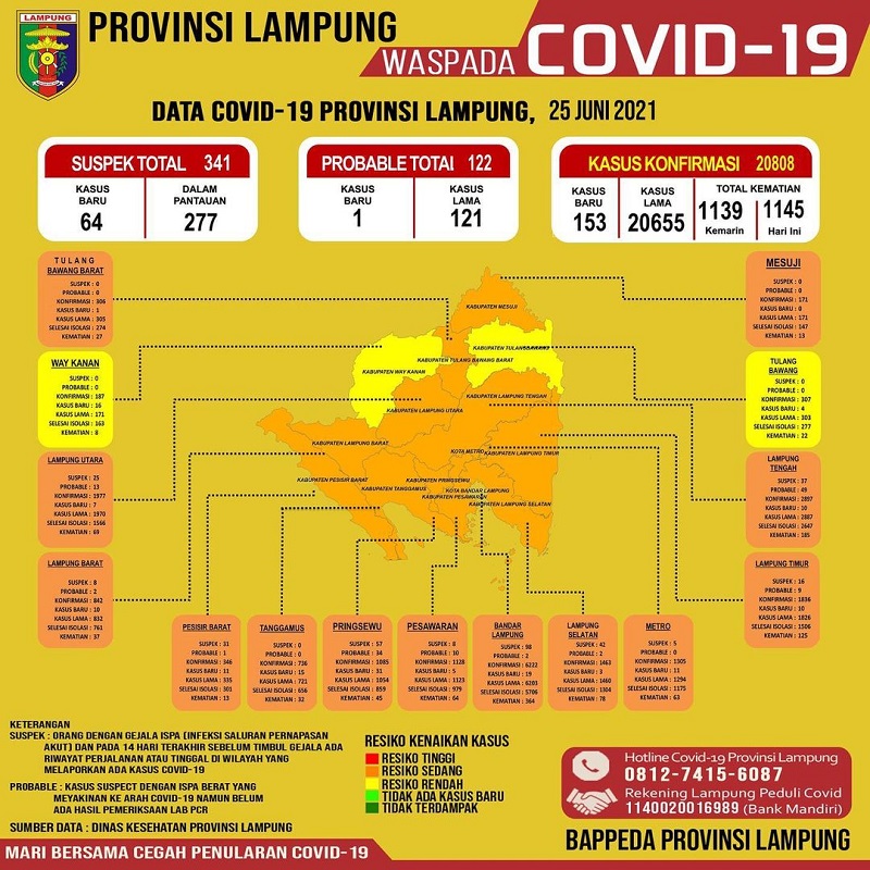 WARTAMU.ID – Hari ini ada penambahan 16 (enam belas) kasus terkonfirmasi positif covid-19 yang ada di Kabupaten Way Kanan. Hal ini dibenarkan oleh Juru Bicara Tim Gugus Tugas Covid 19 Kabupaten Way Kanan Anang Risgianto Kadis Kesehatan . Jumat (25/6/2021)