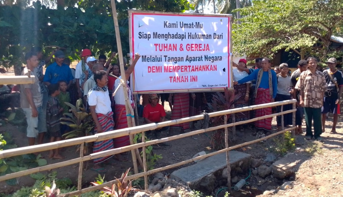 “Kami umatmu siap menghadapi hukuman dari Tuhan dan Gereja melalui tangan aparat negara demi mempertahankan tanah ini,” tulis spanduk yang dipasang di Pedang.