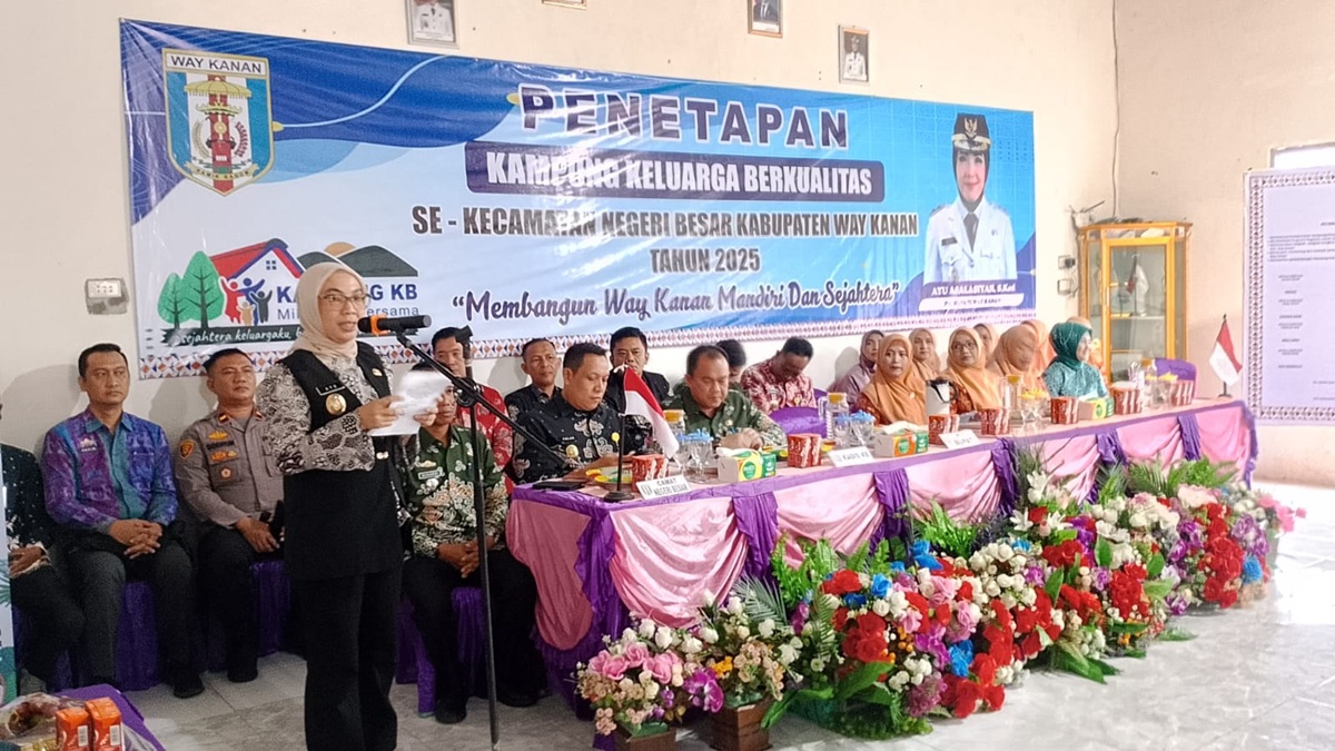 WARTAMU.ID, Way Kanan – Pelaksana Tugas (Plt.) Bupati Way Kanan, Ayu Asalasiyah, S.Ked, menghadiri acara Penetapan Kampung Keluarga Berkualitas (Kampung KB) tingkat Kecamatan Negeri Besar Tahun 2025. Kegiatan ini berlangsung di Balai Kampung Tanjung Mas pada Kamis, 15 Mei 2025, dan turut dihadiri oleh Pj. Ketua Dharma Wanita Persatuan, Medias Imroni Arie Anthony.