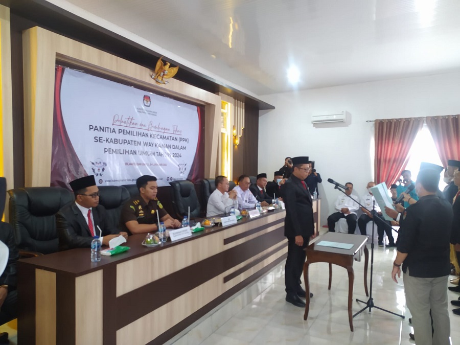 WARTAMU.ID, Way Kanan (Lampung) – Berdasarkan surat Keputusan Komisi Pemilihan Umum (KPU) Kabupaten Way Kanan nomor : 12 Tahun 2022 tentang Penetapan dan Pengangkatan Panitia Pemilihan Kecamatan Kabupaten Way Kanan untuk Pemilihan Umum tahun 2024, maka sebanyak 75 orang anggota PPK dari 15 Kecamtan yang ada di Kabupaten Way Kanan resmi dilantik. Pelantikan tersebut berlangsung di Aula Nuwa Demokrasi KPU Way Kanan pada Rabu pagi, 4/1/2023.