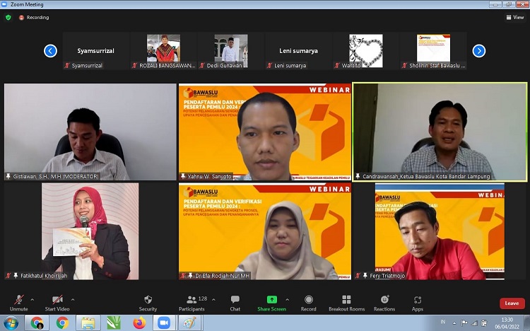 Kegiatan yang digelar pada Rabu, 6 April 2022 ini dihadiri sebanyak 165 Peserta, berasal dari Penyelenggara Pemilu (unsur Bawaslu dan KPU) di daerah seluruh Indonesia, mahasiswa, perwakilan Partai Politik tingkat Kota Bandar Lampung sebanyak tiga orang setiap partai politik dan juga diperuntukan bagi kalangan umum, serta dimoderatori oleh Anggota Bawaslu Kota Bandar Lampung, Gistiawan, S.H., M.H.