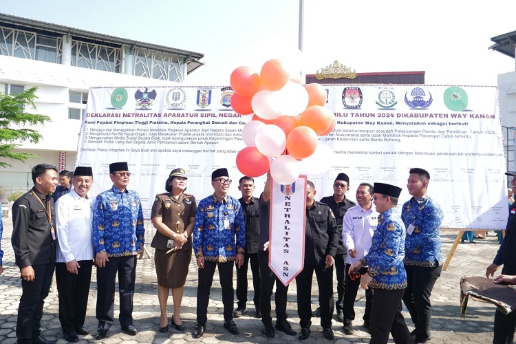 Usai sambutan, dilanjutkan dengan Deklarasi Netralisasi Aparatur Sipil Negara yang dipimpin oleh Sekretaris Daerah Kabupaten, Saipul, S.Sos.,M.IP, diikuti seluruh ASN serta bersama Wakil Bupati Drs. H. Ali Rahman, S.T.,M.T, Sekretaris Daerah Kabupaten, Saipul, S.Sos.,M.IP, para Pejabat Eselon II, III dan IV, Pejabat Fungsional Way Kanan, Direktur RSUD ZAPA, Ketua KPU Way Kanan, Ketua BAWASLU Way Kanan, Pimpinan Kecamatan se-Kabupaten Way Kanan.
