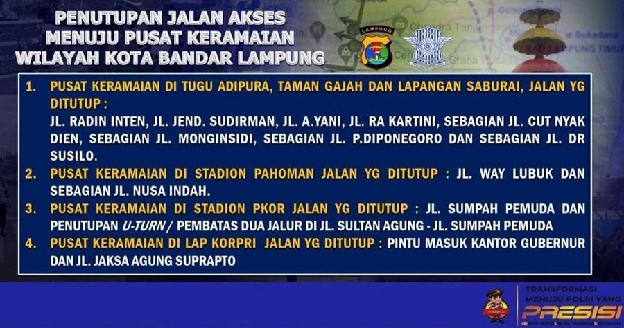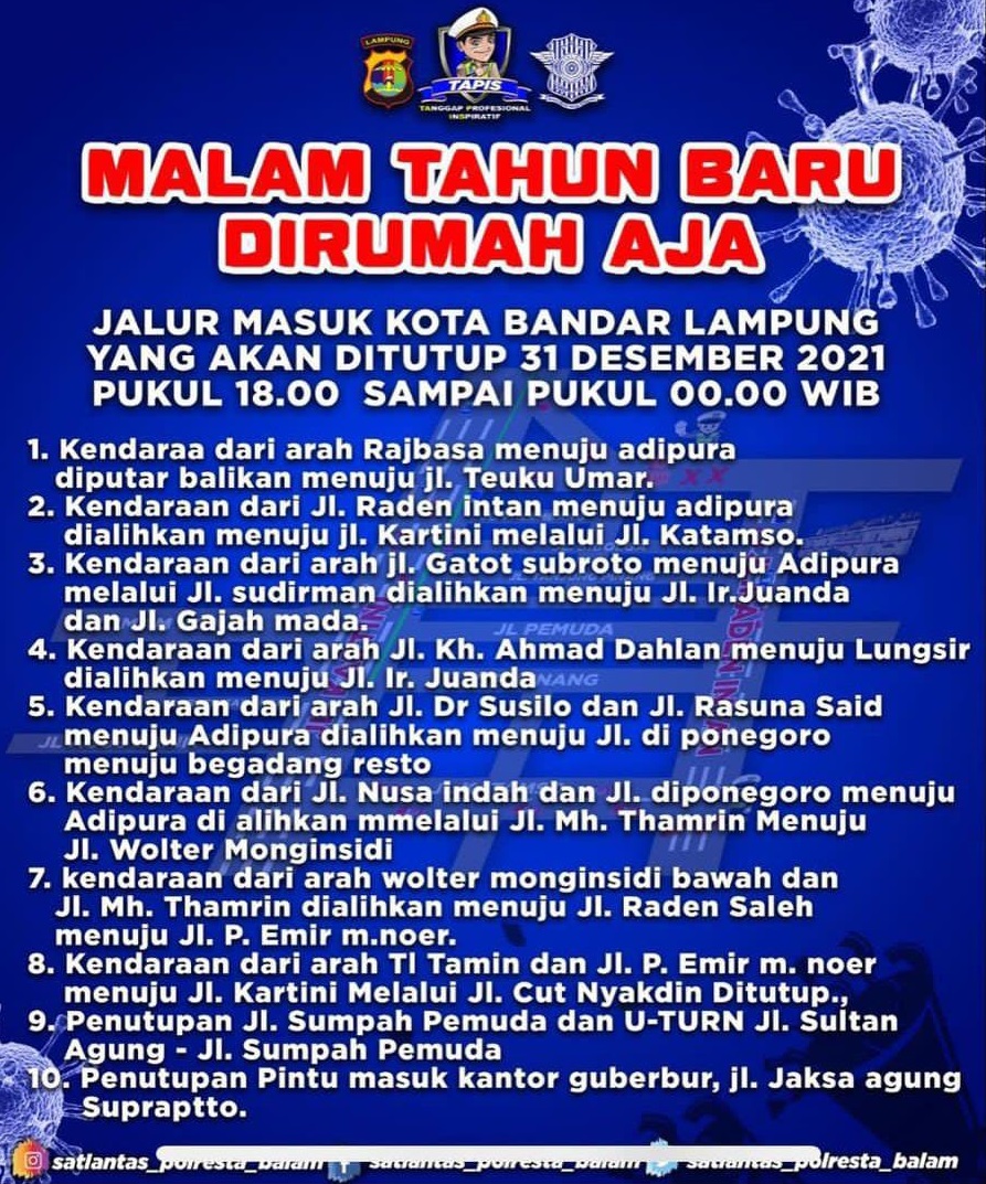 WARTAMU.ID, Bandar Lampung – Menjelang perayaan tahun baru 2022, Satlantas Polresta Bandar Lampung akan memberlakukan penutupan akses jalan menuju pusat keramaian di Bandar Lampung. Penutupan ini guna mencegah terjadinya kerumunan saat malam tahun baru 2021 khususnya di Kota Bandar Lampung.