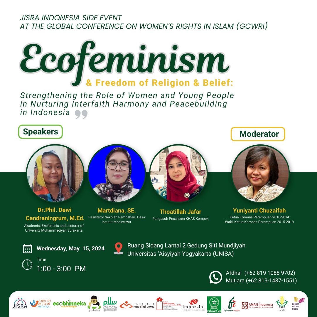 Di tengah rangkaian konferensi yang dihadiri oleh peserta dari berbagai wilayah di dunia tersebut, JISRA mengadakan talkshow pada Rabu 15 Mei 2024 dengan mengangkat tema: Ecofeminism dan Kebebasan Beragama & Berkeyakinan: Memperkuat Peran Perempuan dan Anak Muda dalam Merawat Kerukunan Lintas Iman dan Pembangunan Perdamaian di Indonesia.