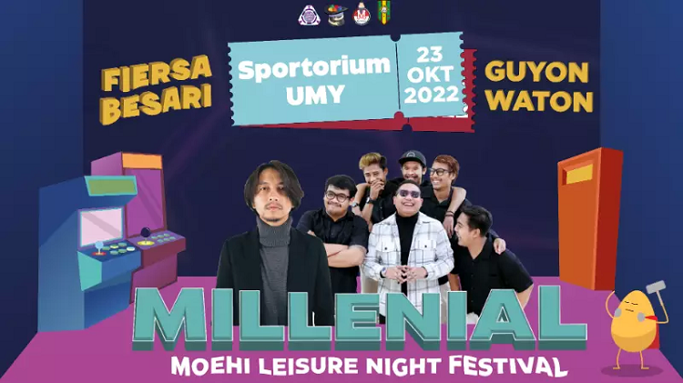 Kegiatan Moehi Leisure Night Festival (MILLENIAL) 2022 akan dilaksanakan pada Ahad, 23 Oktober 2022 mulai pukul 15.00 – 22.00 WIB di Sportorium Universitas Muhammadiyah Yogyakarta. Acara MILLENIAL akan menghadirkan bintang tamu Fiersa Besari dan Guyon Waton.