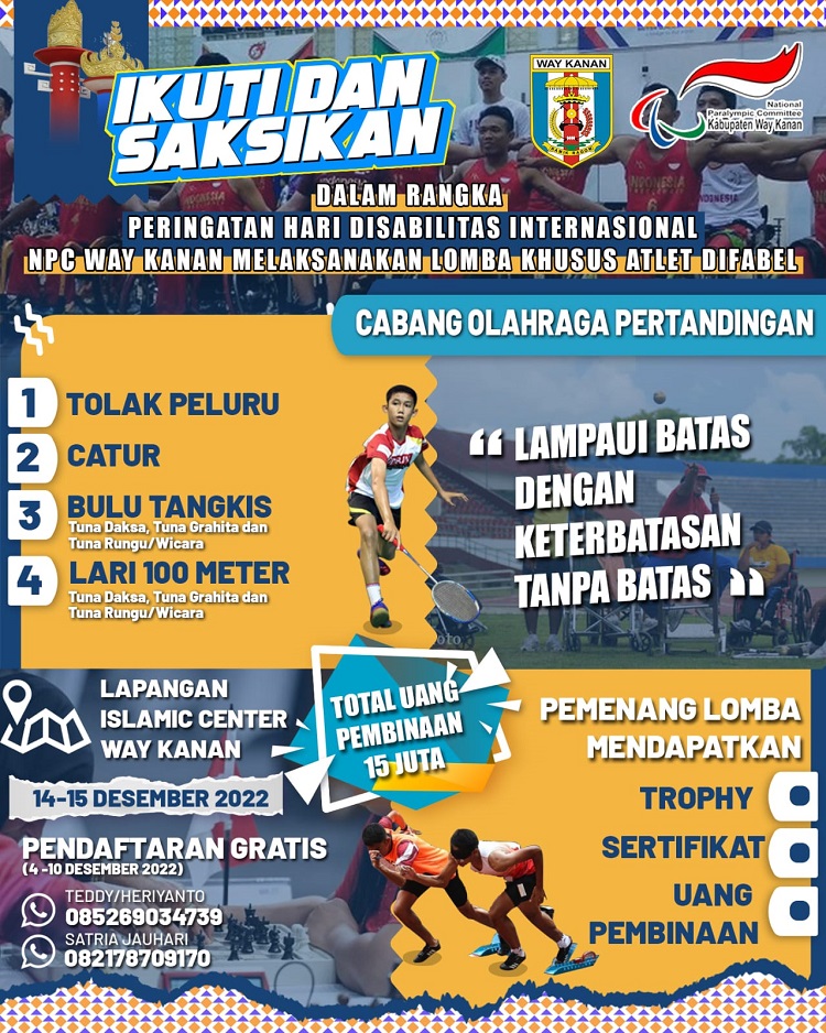 WARTAMU.ID, Way Kanan – Dalam rangka memperingati Hari Disabilitas Internasional 2022, National Paralympic Comitee (NPC) Kabupaten Way Kanan akan mengelar lomba.
