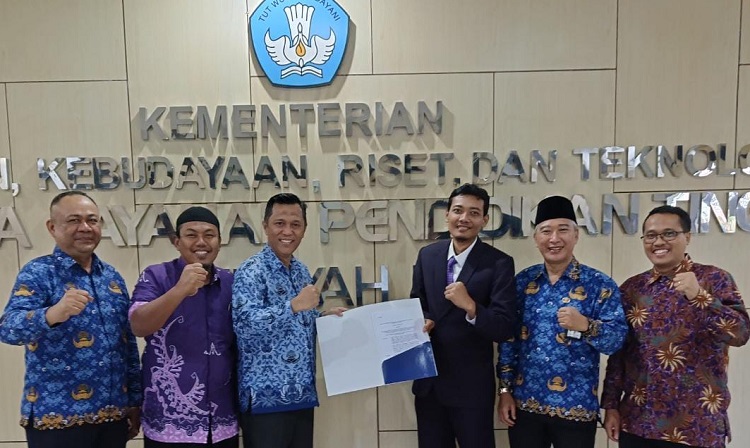 Kepala LLDIKTI Wilayah II Sumsel Prof. DR. Iskhaq Iskandar, M.Sc didampingi Kepala Bagian Tata Usaha Fansyuri Dwi Putra, S.E., M.Si menyerahkan Surat Keputusan (SK) Menteri Riset, Teknologi dan Pendidikan Tinggi Nomor 440/E/O/2023 tentang Izin Pembukaan Program Studi Keperawatan Program Magister, di LLDIKTI Wilayah II Sumsel, Kamis (1/6).