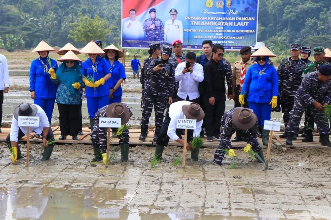 WARTAMU.ID, Pesawaran, Lampung – Pj. Gubernur Lampung Samsudin mendampingi Menteri Pertanian Andi Amran Sulaiman beserta Wakasal Laksamana Madya TNI Erwin S. Aldhedarma dan Ketua Komisi IV DPR RI Sudin dalam acara Gebyar Panen Raya Padi dan Jagung Hibrida sekaligus Tanam Padi yang diselenggarakan di Pangkalan Utama TNI AL Lampung. Kegiatan ini bertujuan untuk menyukseskan program pemerintah dalam menjamin ketahanan pangan dengan mengaktifkan lahan tidur menjadi lahan produktif serta memberdayakan masyarakat sekitar guna meningkatkan kesejahteraan masyarakat dan persediaan pangan. (10/07)