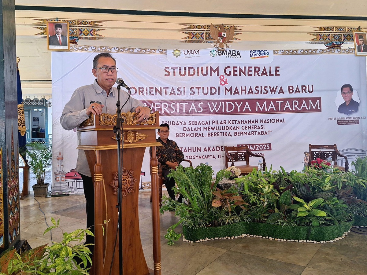 WARTAMU.ID, Yogyakarta – Para mahasiswa baru perlu memahami budaya dan norma akademik yang akan menjadi landasan keberhasilan mereka selama menjalani studi di perguruan tinggi. Kampus bukan hanya tempat mencari ilmu, tetapi juga tempat membangun peradaban. Hal ini disampaikan oleh Rektor Universitas Widya Mataram (UWM), Prof. Dr. Edy Suandi Hamid, ketika menjadi keynote speaker dalam acara Studium Generale bertema “Budaya sebagai Pilar Ketahanan Nasional dalam Mewujudkan Generasi Bermoral, Beretika, Bermartabat” pada Rabu (11/09) pagi di Pendopo nDalem Mangkubumen, Kampus 1 UWM. Acara ini merupakan bagian dari rangkaian Orientasi Studi Mahasiswa Baru (OSMABA) Tahun Akademik 2024/2025 dan dihadiri oleh seluruh mahasiswa baru serta jajaran pejabat rektorat dan dekanat UWM. Selain itu, acara ini juga menghadirkan narasumber Mantan Deputi Bidang Kajian Strategis Lembaga Ketahanan Nasional (Lemhannas), Prof. Dr. Ir. Djagal Wiseso Marseno, M. Agr.