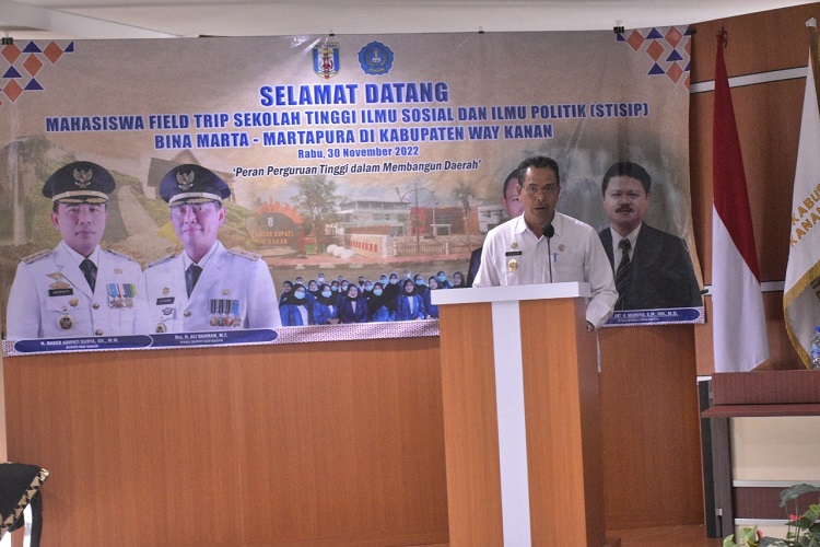 WARTAMU.ID, Way Kanan – Bupati H. Raden Adipati Surya, S.H.,M.M menerima Kunjungan Field Trip Mahasiswa Sekolah Tinggi Ilmu Sosial dan Ilmu Politik Bina Marta, Martapura Sumatera Selatan di Pemerintah Kabupaten Way Kanan, Rabu (30/11/2022), di Ruang Rapat Utama Pemkab Way Kanan, yang dihadiri oleh Ketua STISIP Bina Marta Martapura, Dr. Tri Susilo, S.H.,M.Hum beserta jajaran, Staf Ahli Bidang Pemerintahan, Hukum dan Politik, Dinas Pemberdayaan Masyarakat dan Kampung, Badan Perencanaan Pembangunan Daerah, Badan Kepegawaian dan Pengembangan SDM, Bagian Tata Pemerintahan, Bagian Organisasi, Bagian Kerjasama dan Bagian Hukum Setdakab.